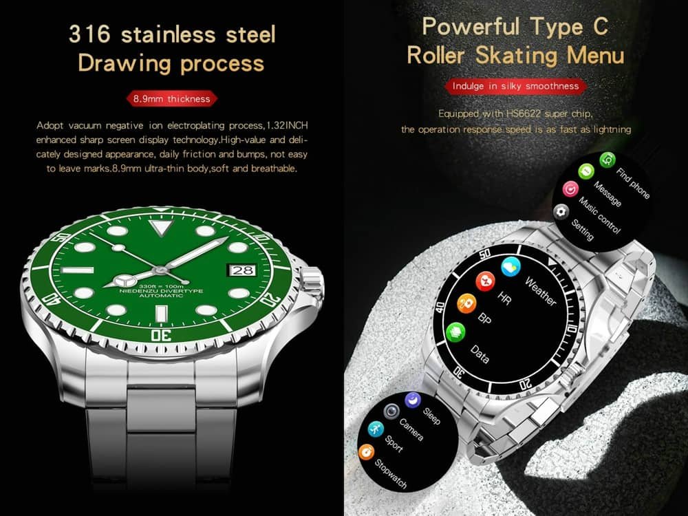 1.32″” touch screen equipped with 320*320 pixel resolution can provide you with a clearer visual experience. The smart watch available to choose from more dials within the app. You can also personalize your watch face from your photo album.