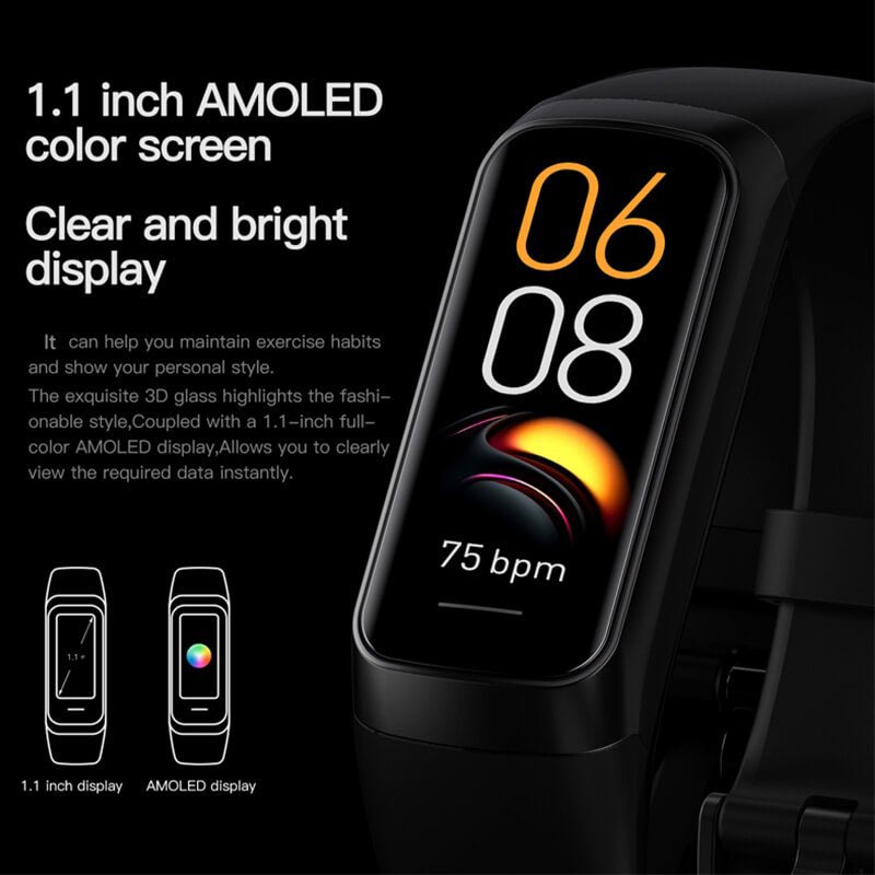 1.1″” AMOLED touch screen equipped with 294*162 pixel resolution can provide you comfortable touch and excellent visual experience. This watch has several built-in new dials and the dial market has more personalized dials for you to choose from. A delicate gift for holidays or daily occasions.